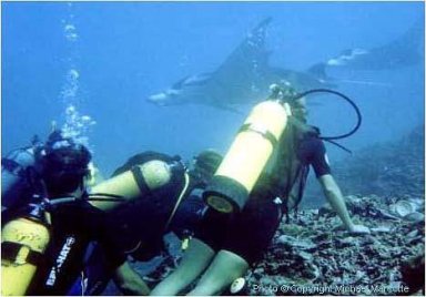 Picture the Imperial Cruiser in Star Wars slowly creeping overhead in a scene from the movie, and you might better appreciate the only somewhat lesser perspective and sense of awe that I felt as these gentle and magnificent giants swam above us. The dive guide agreed with our later consensus topside that the largest of the three mantas was approximately eighteen to twenty feet across, wing tip to wing tip. The second was slightly, but not much smaller, and the third was still another foot or so smaller. Perhaps my photo provides an idea of their magnitude, as it shows three manta rays passing at a distance of some thirty-five to forty feet away. Even with the other divers’ backs to my camera, I think you can still sense the kind of impression the mantas were making. Mantas are particularly unique among the rays, not only due to their size, but also in the curiosity that this species exhibits towards humans. Not unlike dolphin and whales, mantas are known for their curiosity and unusual behavior such as intentionally approaching divers, exemplified in our case by the turnabout and gracious second inspection pass that these three provided.